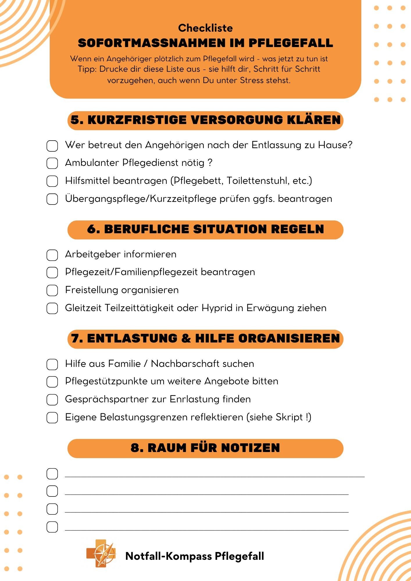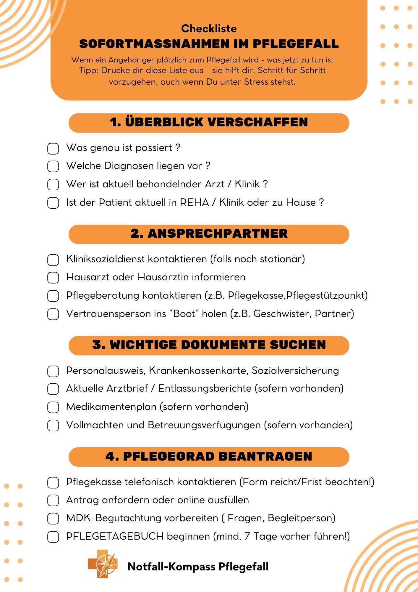 Diese Checkliste bietet Ihnen im Pflegefall eine erste Orientierung und enthält die wichtigsten Punkte in ihrer Situation.